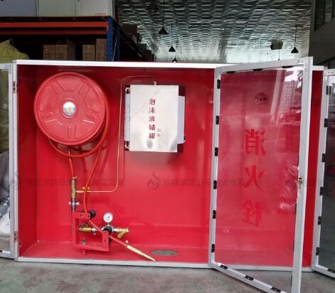 2、泡沫消防箱由箱體、消防軟管、泡沫滅火劑存放箱、泡沫槍、消防報警器等組合而成,是一種新型固定式滅火裝置。