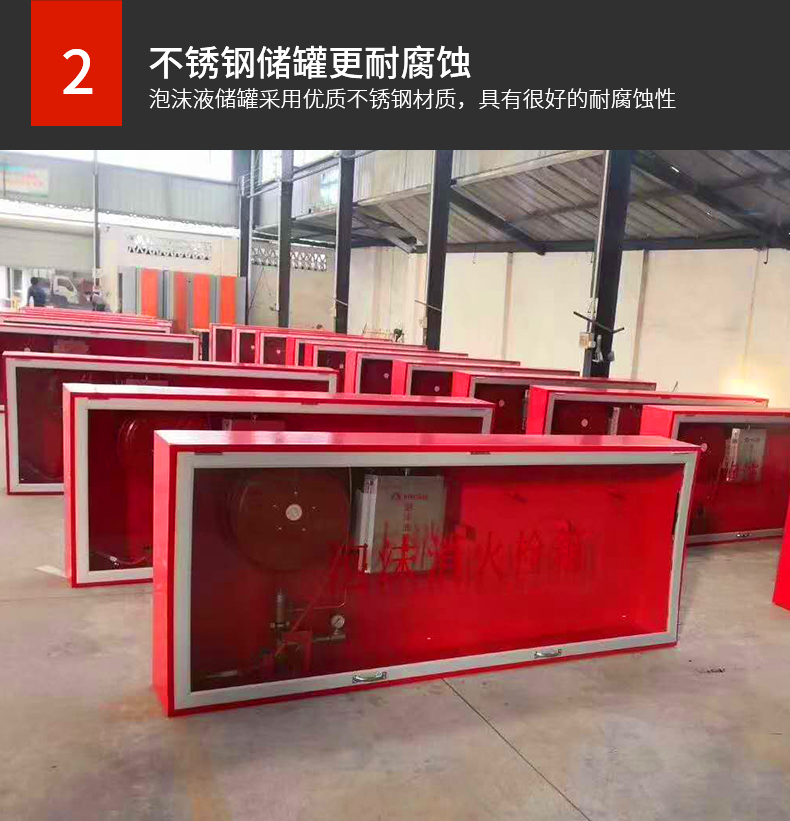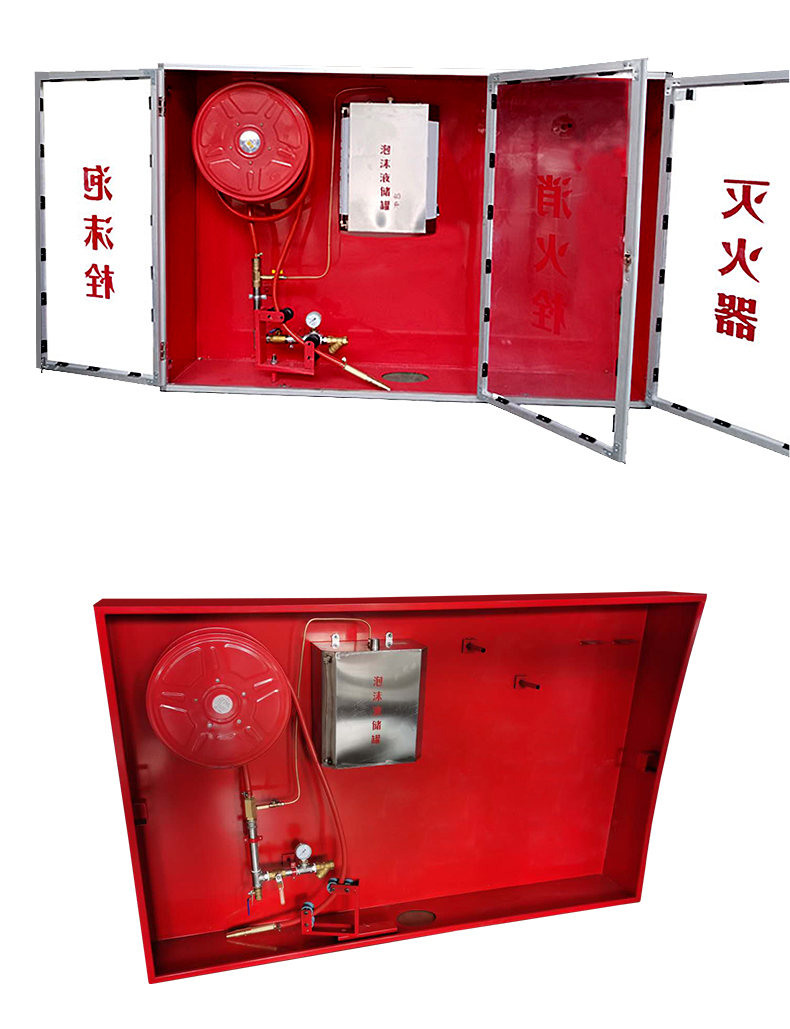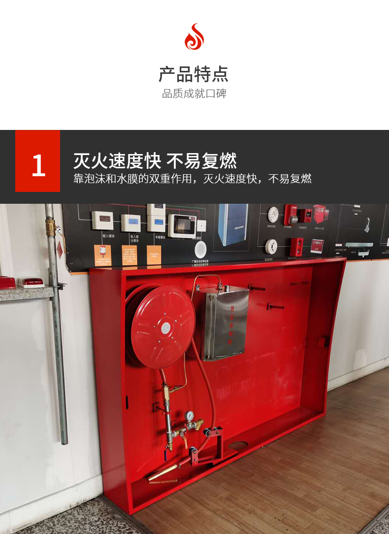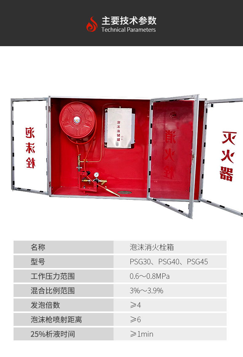 水成膜泡沫消火栓箱是新型、高效低倍數(shù)泡沫固定滅火裝置。當壓力水經(jīng)過比例混合器時,可使水與泡沫液按規(guī)定比例混合,經(jīng)發(fā)泡槍產(chǎn)生泡沫撲救有機固體物類、可溶化的固體類火災,尤其對撲滅木材、棉花和油類火災更有特殊效能。