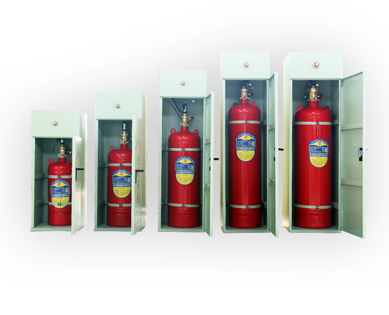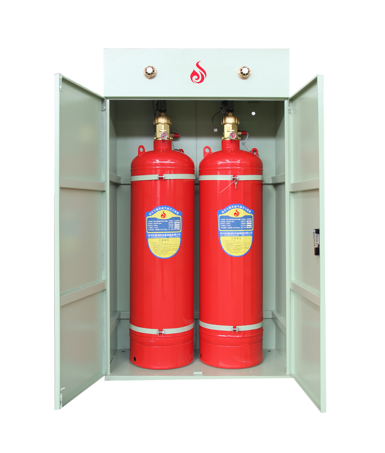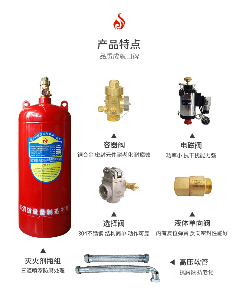 柜式七氟丙烷滅火裝置包括:滅火劑瓶組、高壓軟管、電磁型驅(qū)動裝置、信號反饋裝置、噴嘴、柜體、七氟丙烷滅火劑組成。
