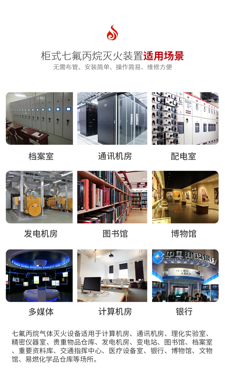 柜式七氟丙烷滅火裝置適用于計算機房、通訊機房、理化實驗室、精密儀器室、貴重物品倉庫、發(fā)電機房、變電站、圖書館、檔案室、重要資料庫、交通指揮中心、醫(yī)療設(shè)備室、銀行、博物館、文物館、易燃化學(xué)品倉庫等場所。
